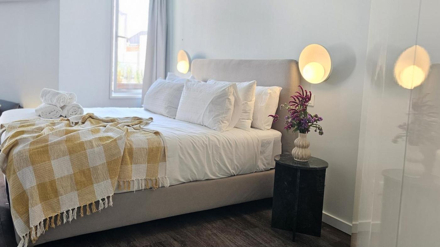 Studio Apartment with Queen Bed. The air-conditioned apartment has 1 bedroom and 1 bathroom with a bath and a shower. Guests can make meals in the kitchen that has a stovetop, a dishwasher, kitchenware and an oven. The apartment features a flat-screen TV, a washing machine, a tea and coffee maker, a seating area as well as city views. The unit has 1 bed.