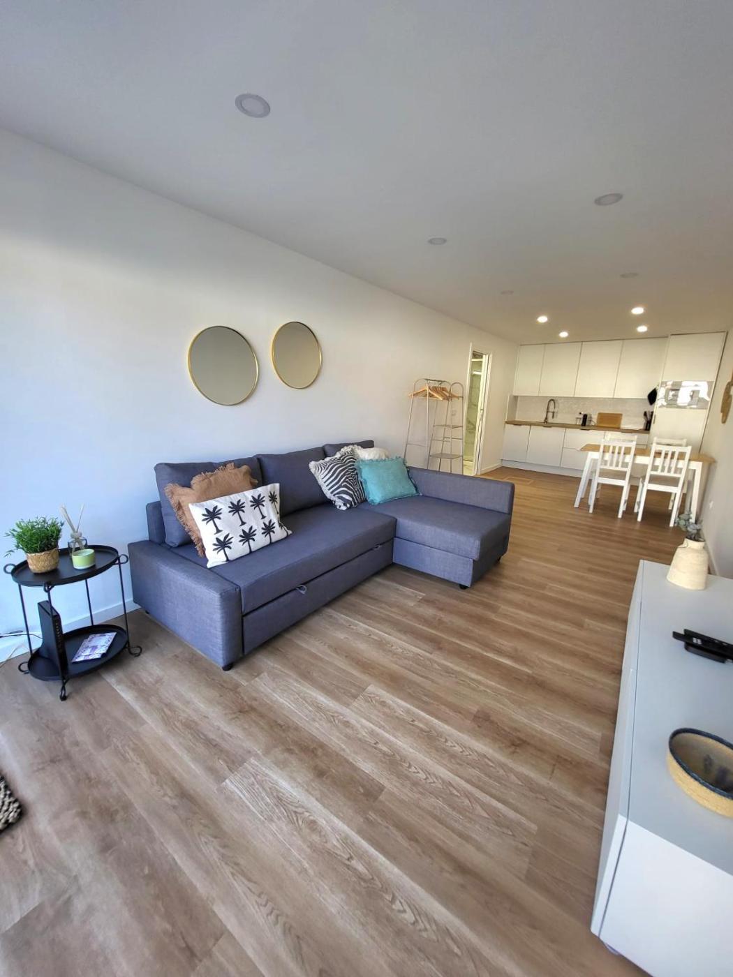 No piso térreo, este apartamento apresenta 1 quarto, uma kitchenette equipada com frigorífico e máquina de lavar louça, uma sala de estar e uma televisão de ecrã plano.