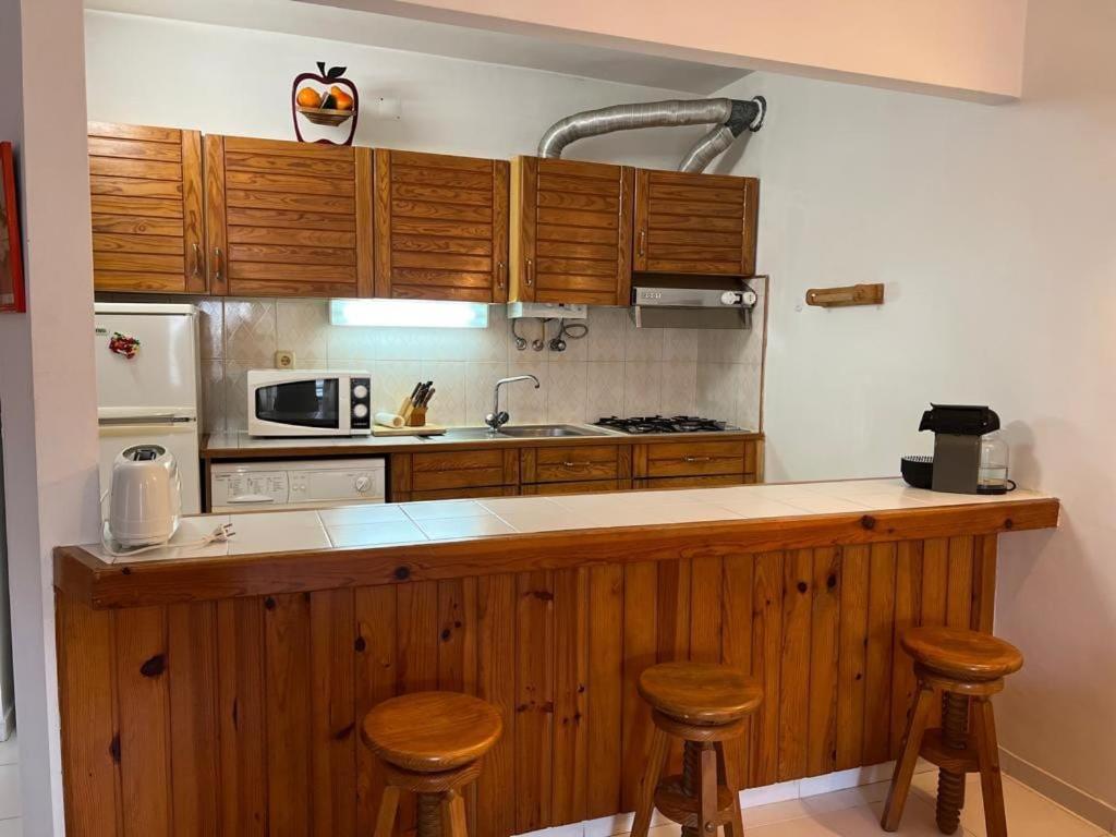Apartamento com Vista Mar. The well-equipped kitchen features a stovetop, a refrigerator, kitchenware and a microwave. The apartment offers a washing machine, a tea and coffee maker, as well as a private bathroom featuring a bath and a bidet.