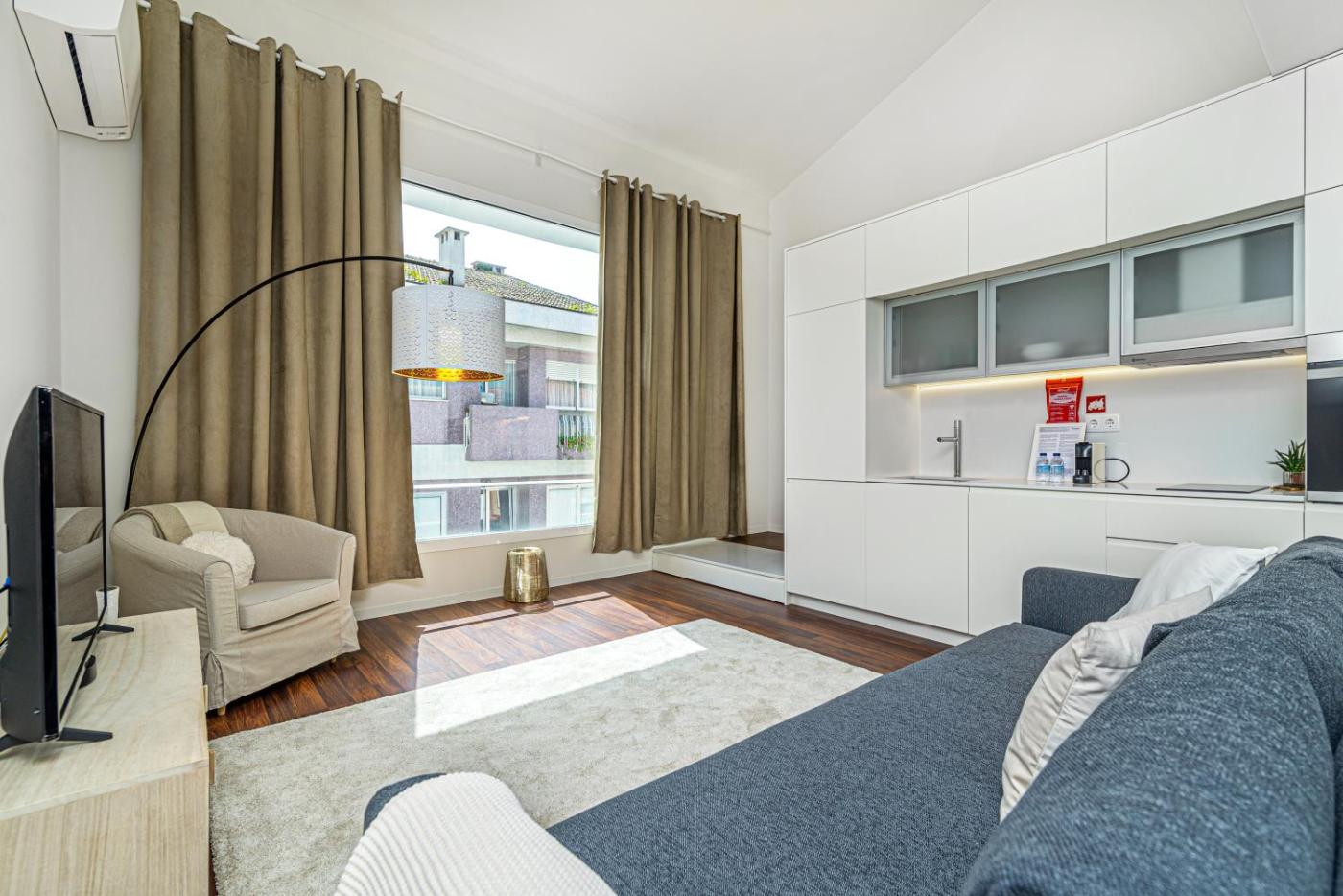 Estúdio Deluxe. The studio has a private bathroom, a washing machine, a coffee machine, as well as a seating area with a flat-screen TV. The well-equipped kitchenette features a stovetop, a refrigerator, a dishwasher and kitchenware. Rooms on the upper floors are reachable by lift. The unit has 1 bed.