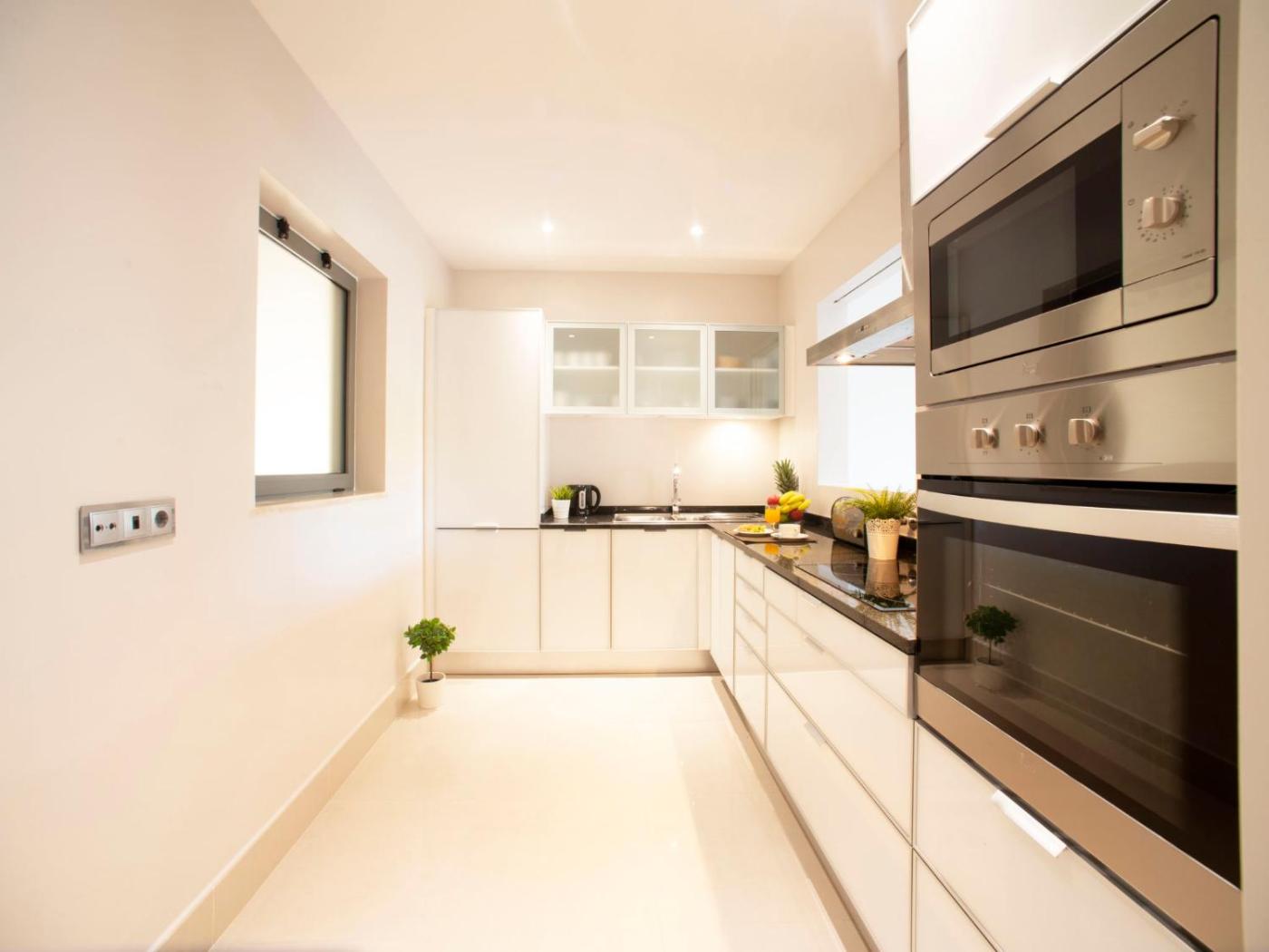 Este apartamento com ar condicionado tem 2 quartos, uma sala de estar, uma cozinha totalmente equipada com frigorífico e máquina de café, e 2 casas de banho com chuveiro e um secador de cabelo. Uma televisão de ecrã plano está disponível.